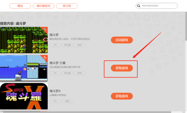 按压回车键得到搜索结果后,下滑找到想要下载的魂斗罗版本,点击对应选项右侧的“获取游戏”按钮,就能下载魂斗罗了。