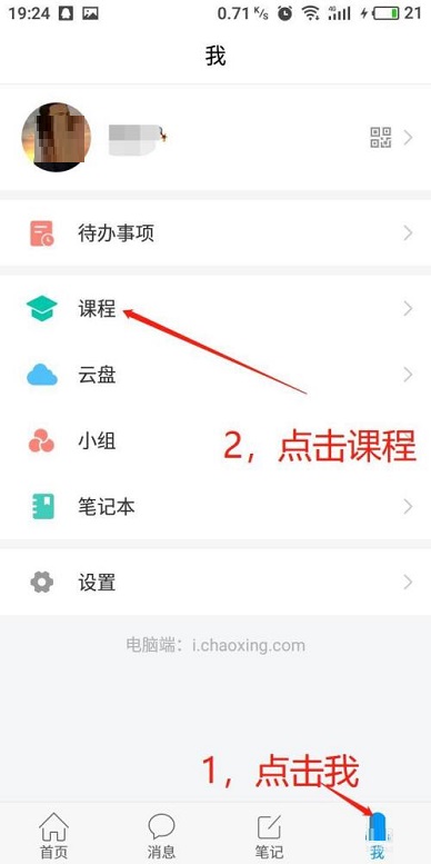 第二步:点击右下角‘我’,点击课程(如图所示)。