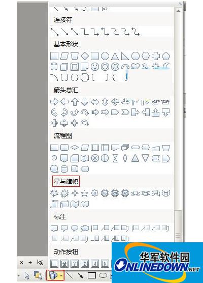 2、光标点击页眉或者页脚,然后点击绘图工具栏的自选图形按钮,在星与旗帜中选择一款喜欢的图案。