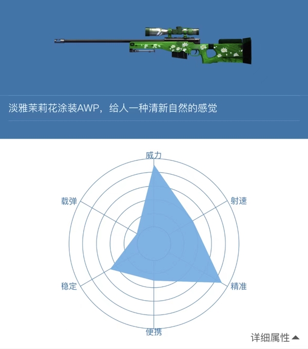 AWP-茉莉,同时作为春季纪念武器与竞技热门武器,从而热度较高,而且很多玩家的仓库中都会有一把。茉莉涂装可以给玩家一种清新自然之感,再加上AWP原先的绿色调,不但毫无违和,而且尽显春之色彩。