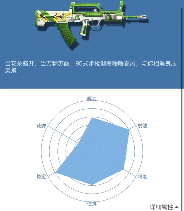 古朴的花间纹饰,给95式添加一副神秘色彩,让玩家看到它,有一种漫步花间之感,着实是非常浪漫了!另外,95式在现实中作为我国生产的武器,对此也会激起大家的家国情怀,肯定争着抢着来一把!