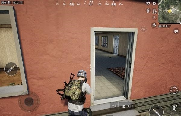2,比如参考下图中的情况,对手其实就隐藏在房间中,我们可以先把这个房门打开或者原地使用武器发出声音,让对手误以为我们就在这个位置,然后再快速的去另一侧进行攻击,这个方法更加适用于双排或多排,和队友形成配合,可以打对手一个措手不及。