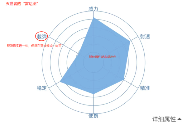 小编从逆战助手上找到了灭世者手套的“雷达图”,根据其雷达图可见,灭世者手套在装弹上确实是短板(36/72),36发的弹匣可能在猎场等模式上属实难受,但是在竞技模式中,合理利用弹药,该短板几乎可以无视;然而出色的其他属性可以让灭世者手套在竞技模式中大杀四方。