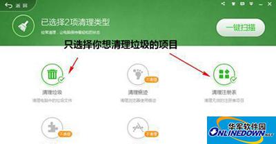 2、然后,根据需要选择要清理垃圾的类型,避免将不想要清理的项目也清理掉(例如不想清理历史记录,则不要选择清理痕迹)。选择完毕后,点击“一键扫描”按钮。