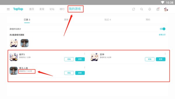 2.想要查看游戏时长的,可以在TapTap模拟器上,选择“我的游戏”一栏,在游戏选项中就能看到游戏时长统计数值。