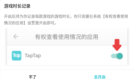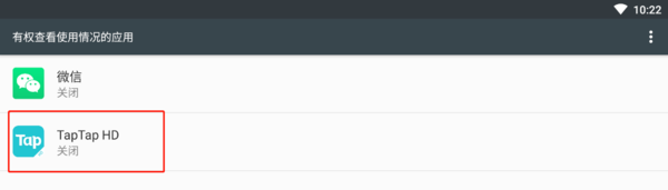 4.跳转到“有权查看使用情况的应用”窗口后,点击“TapTap?HD”选项。在弹出的页面中,打开允许访问使用记录的功能,就能开启游戏时长统计了。