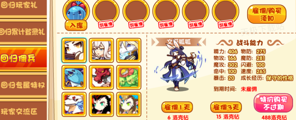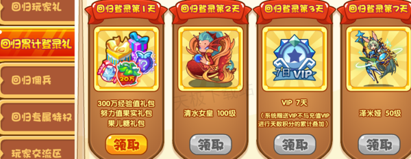 2.回归累计登录礼:除了基础的道具外,还有100级清水女皇,50级泽米娅,以及免费VIP7天。