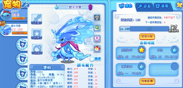 4.水灵兽怎么进化为碧水灵兽:先把水灵兽喂经验喂到100级,然后去皇家研究院——实验工坊——破茧重生,使用2黄2紫1蓝的精粹即可进化。