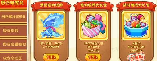 1.直接领取的奖励:满级宠物碧水灵兽3天试用,500Q经验礼包+10个果糖+5个开心豆,3个服装+努力果实礼包+10个灵兽丹。这都是一些短时间提升比较明显的道具。