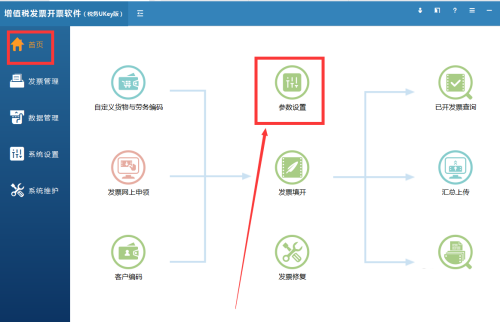 第一步:打开增值税发票开票软件税务UKey版,点击首页,选择参数设置。
