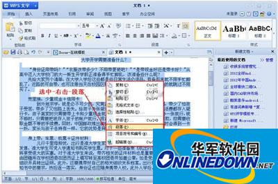 首先,选中你要进行调整设置的文章,可以全文设置,也可以段落设置。下面以全文为例进行段落行距的设置:ctrl+a(全选)—右击文章—段落。