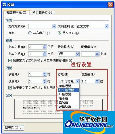 打开段落设置的对话框以后,根据自身需要在段落“缩进和间距”—“间距”—“行距”中进行行距设置。