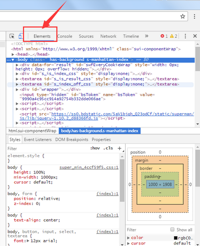 打开后,在Elements里的代码就是该页面的源代码了,若想要查找特定内容,只需点击浏览器右上角的菜单中打开“查找”即可;
