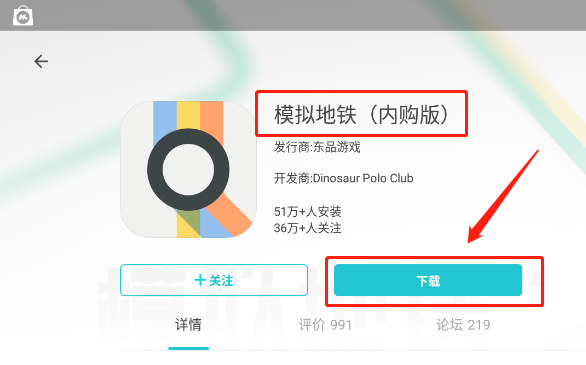 跳转到搜索界面页面之后,找到并打开“模拟地铁(内购版)”,在游戏详情页面,选择下载键安装游戏就行了。