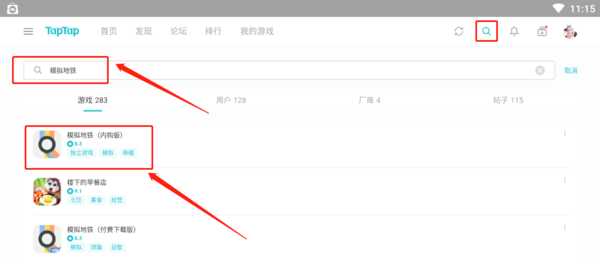 小编这里以《模拟地铁》这款游戏为例,在电脑上打开TapTap模拟器之后,点击右上角的搜索图标,之后直接在搜索框中,输入模拟地铁字样进行搜索。