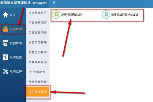 第一步:打开增值税发票开票软件税务UKey版软件,单击“发票管理”-“打印格式查看”,单击“发票打印格式设计”或“销货清单打印格式设计”。