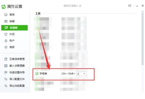 第三步:进入“快捷键”界面后,在“工具”选项下,勾选“字根表”即可设置快捷键,如图所示。