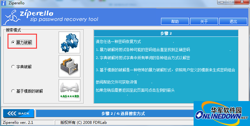 6.之后点击“next”,在弹出的页面选择破解方式,如果自己有一些备选的密码是那么就可以选择“字典破解”,如果是比较复杂的则可以选择暴力破解,大家也可以一个一个试一下。