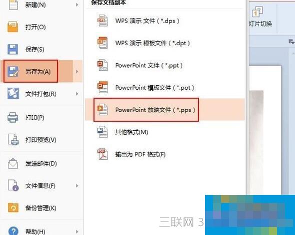 ③这样只能自动切换,但没有实现自动放映的功能。我们将其另存为pps格式,就是放映格式,这样一打开就自动放映了。