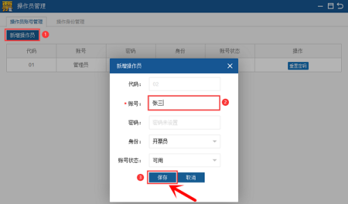 第二步:进入操作员账号管理,点击新增操作员,输入开票员信息,身份选择开票员,点击保存。