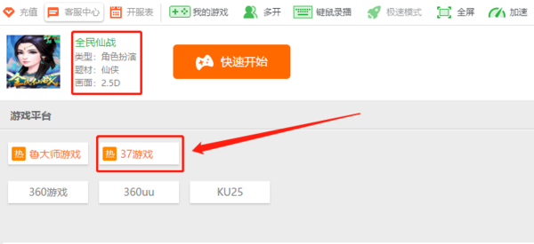 37网页游戏平台作为比较热门的网站,新浪页游助手上的游戏基本上都有37游戏平台,因此玩家只需要打开一款37游戏支持的网游,比如说“全民仙战”。在游戏详情界面,点击游戏平台选项中的“37游戏”按钮,就能使用37游戏平台开始游戏了。