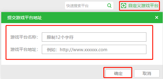 首先同样是在新浪页游助手上,打开对应的游戏详情页面,点击游戏平台右侧的“自定义游戏平台”字样。在弹出的窗口中,输入游戏平台名称和网址,点击确定提交申请后,等待审核通过就行了。