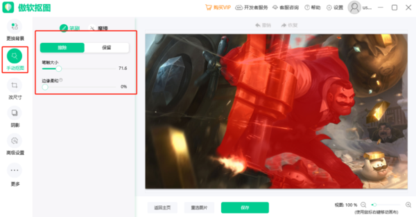 在这里我们可以使用左侧的“手动抠图”,这样可以更精准的将需要抠图的部分选中,然后在右侧我们可以看到框选出来的部分是不是自己所需要的部分,确认无误后导出保存就可以了。