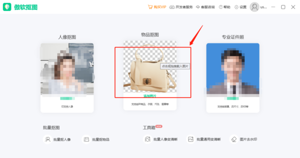 打开傲软抠图,在主界面选择中间的“物品抠图”选项,点击后将需要进行抠图的公章图片添加到软件中,然后我们就会进入到抠图界面。