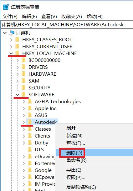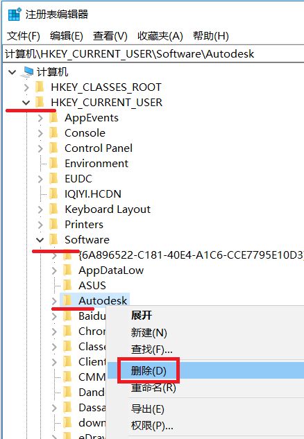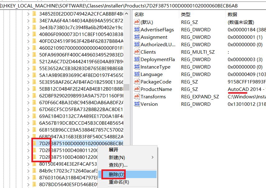 5.找到如下图所示的文件夹,在文件夹中找到7D2开通的文件夹(选择此文件夹,在右侧可以看到AutoCAD的字样),在7D2文件夹上右击,删除。(在本例中,有三个7D2文件夹,都要删除)