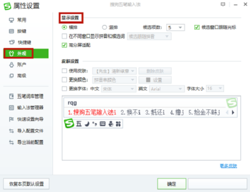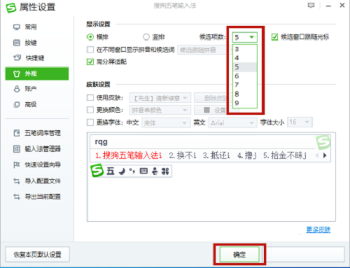 第三步:依次找到【外观】-【显示设置】,点击候选项数后面的小倒三角,选择需要显示的个数,点击下面的【确定】按钮,如图所示。