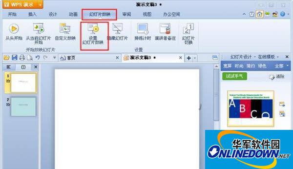 首先使用wps演示打开你的幻灯片,在菜单栏“幻灯片放映”中点击“设置幻灯片放映”按钮,如下图所示: