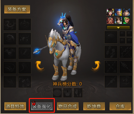 跳转到游戏商城页面之后,在右侧的英雄角色窗口,点击“装备强化”按钮,并选择一个需要强化的装备。