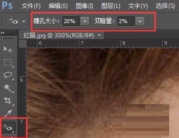 第二步:然后选择红眼工具,在属性栏中设置“瞳孔大小”20%,“变暗量”2%(如图所示)。