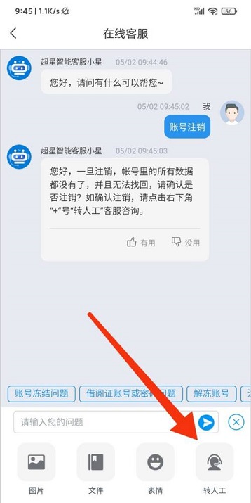 第六步:进入到在线客服页,我们输入账号注销,点击下方的转人工,联系客服注销即可(如图所示)。