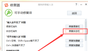 等待修复完成之后,就可以看看输入法的状态栏是否已经成功显示在桌面上,要是没有的话,继续执行修复操作。这次我们选择“手动修复”选项。