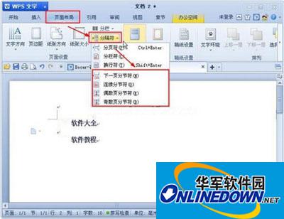 在“页面布局”中找到“分隔符”,点击▽可以看到四种分节符,下一页分节符表示在分节的同时进行分页,连续分节符表示在同一页进行分节,也就是说一页中都可以有多节,奇偶数分节符一般在对双面打印的文档进行排版的时候会用到(如图1);用来保证某些页面始终在装订好的文档翻开后在左边或右边。因为书本的章节的起始页很多都要求固定在奇数页,如图2所示。