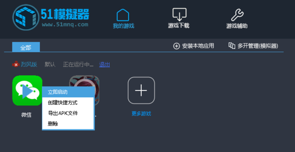 在51模拟器下载添加好游戏之后,点击页面上方的“我的游戏”图标,就能查看所有添加的游戏了。点击对应的图标就能打开对应的游戏应用,选中之后单击鼠标右键,在弹出的悬选项中选择“创建快捷方式”,就能将游戏发送到电脑桌面上。