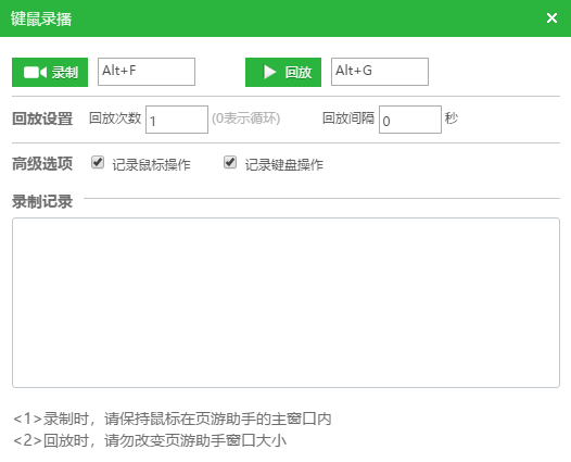 在新浪页游助手上,为了帮助玩家进行一些简单的键鼠操作,软件推出有键鼠录播的功能。同样是在打开游戏之后,点击页面上方的“键鼠录屏”按钮,在弹出的窗口中点击“录制”键进行录制。录制完成后,设置好回放次数和回放间隔,再点击“回放”键就可以了。