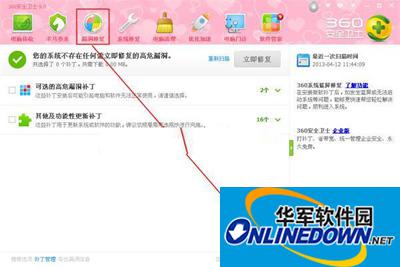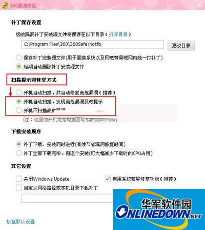 设置“扫描提示和修复方式”,选择“开机不扫描高危漏洞”。你也可以设置成“开机自动扫描,发现高危漏洞及时提示”,这样自动扫描漏洞完成后你可以根据需要进行漏洞修复。