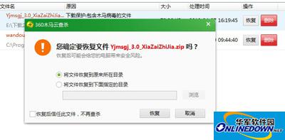 3、设定文件的恢复位置,可以将其恢复到原先的位置,也可以进行自定义。也可以设定文件不再查杀。设置完成后,点击恢复即可(如图三)。