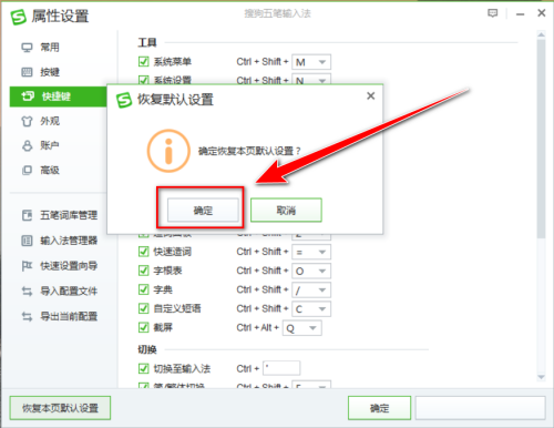 第五步:在【提示框】中,点击【确定】按钮,即可将快捷键恢复到默认设置。
