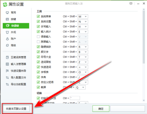 第四步:在【快捷键】设置页中,点击左下角的【恢复本页默认设置】,如图所示。