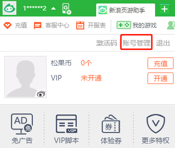 想要修改新浪页游助手账号密码的小伙伴,在电脑上打开新浪页游助手客户端,并登录自己的账号之后,选择页面左上方的账号名称,在出现的选项中点击“账号管理”字样。