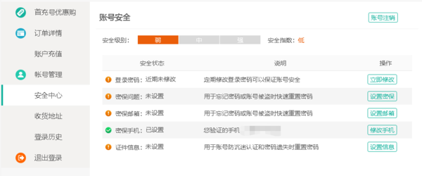 在账号安全中心上,除了能进行密码修改之外,还能设置密保问题、密保邮箱和密保手机号等,用于忘记密码时进行找回。