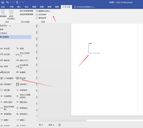 第六步:利用左边栏的“形状图”和工具栏中“工艺工程”等工具进行绘制“工艺流程图”了。如下图: