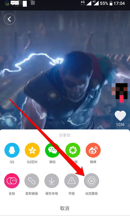 3.点击之后会进入分享页面,大家可以将视频分享到自己常用的社交平台,如果大家想要设置动态壁纸的话,需要找到“动态壁纸”的选项,如下图所示。