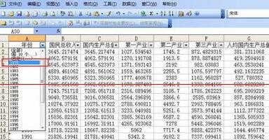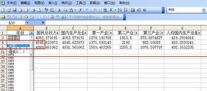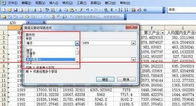 5、此时,会弹出一个“自定义自动筛选方式”的对话框,根据自己需要填写内容,如小编想要筛选出年份为1978年的GDP数据,就选择年份“等于”——“1978”,如果想选择1978年后的,可选择“大于”