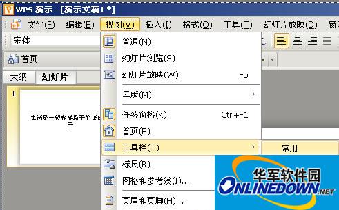 1、点击WPS演示“视图”——“工具栏”——“常用”。这样导航栏中会出现一个新的栏目。