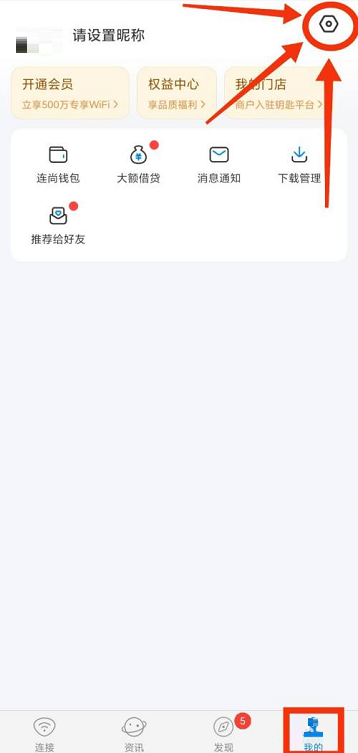 第二步:在WiFi万能钥匙主页中找到右下角的(我的)然后再点击右上角的设置。