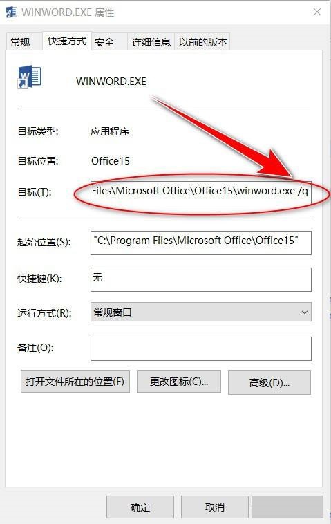 第二步:然后在winword.exe的后面加个空格和/q。这样就可以直接进入word而不打开启动界面(如图所示)。